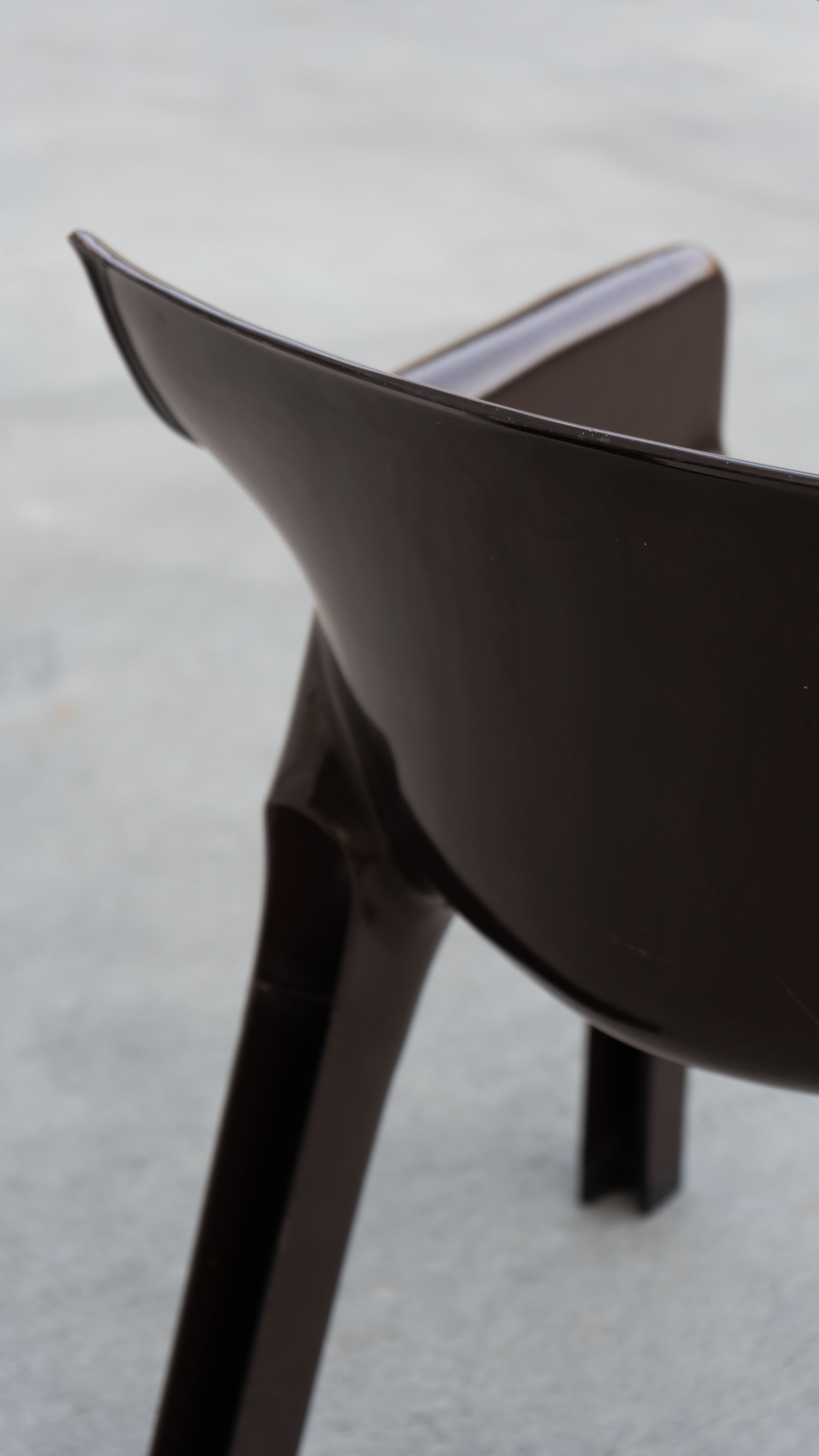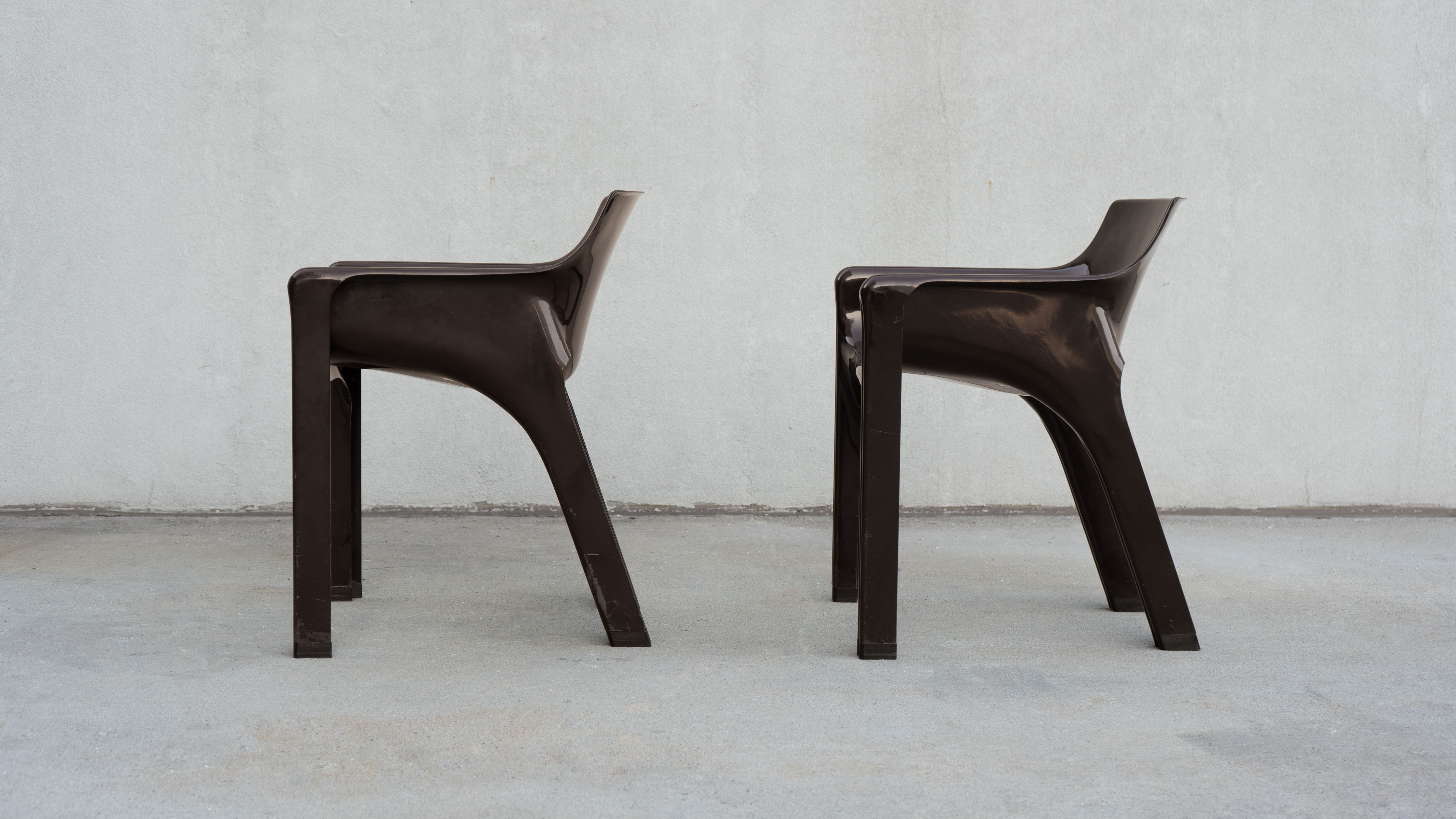 The Gaudi armchair owes its existence to its predecessor, the Selene chair. Both, designed by Vico Magistretti, are single piece construction chairs that come from a pressure mold of polyester resin reinforced with fiberglass to withstand heat and scratching. The form is indicative of Magistretti’s emphasis on material. New technologies and production methods allowed him to experiment with more expressive and sculptural geometries. In comparison to the Selene chair, the Gaudi introduces arm rests that create a dramatic 90 degree slope to the ground. These conteract the rear legs which sit comfortably stretched and angled compared to the Selene’s straight legs. Available as a pair or individually, wear consistent with age. All original feet intact.