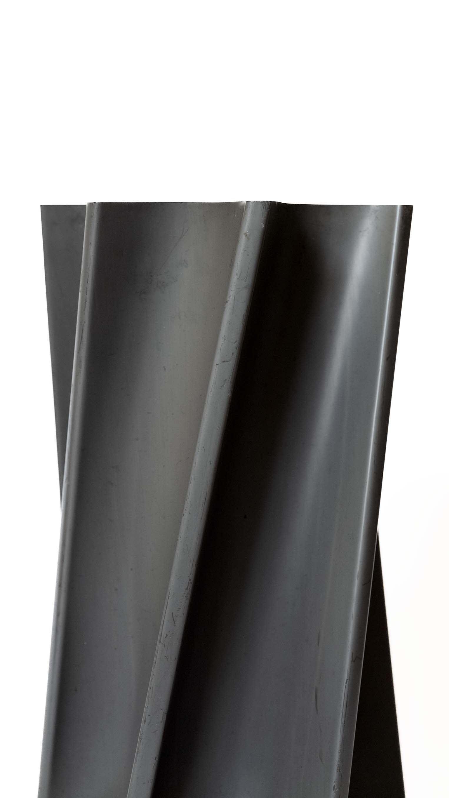 Tortiglione flower vase (model 3083A) designed by Enzo Mari for Danese Milano. Pressure molded fluting suggestive of vegetal morphology. Although this design was recently reissued in a Bamboo series, this is an original first edition example. Metal disc manufacturer's label to underside ‘Danese Milano Made in Italy Enzo Mari 1969’.