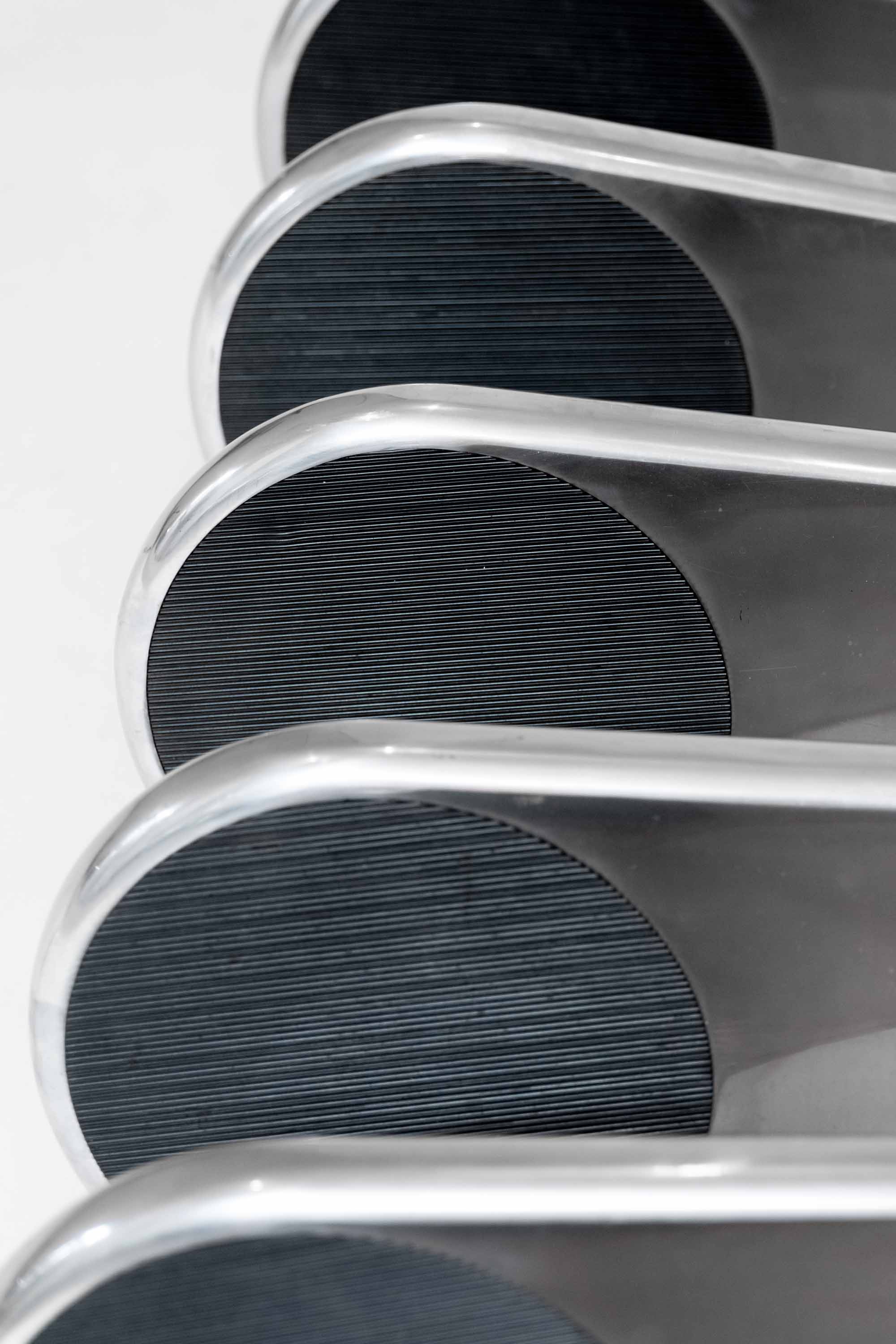 Helicoid staircase, also known as Escalier M400, designed by the French industrial designer Roger Tallon, produced by Sentou. 13 total steps in cast and polished aluminum with black non slip rubber on the surface. Featured in the collection of the Museum of Modern Art in New York City.
